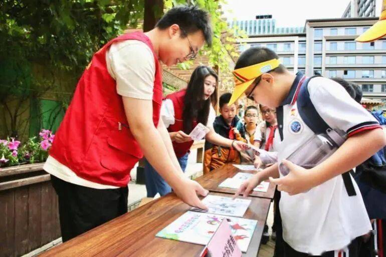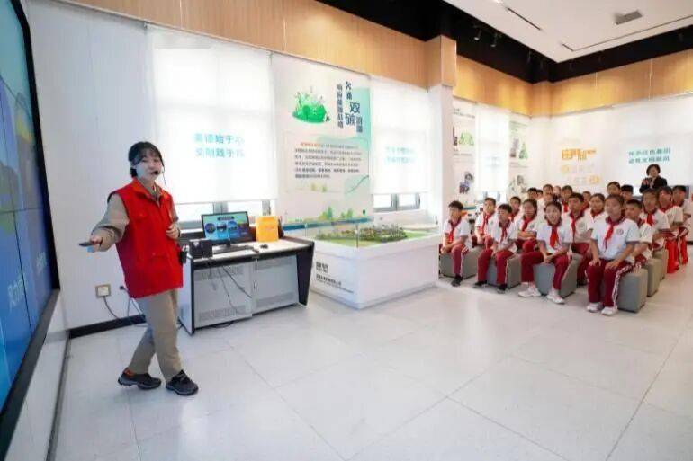 ▲国网天津武清供电公司“碳”路者科技志愿服务队队员在城市综合充电示范站向到访师生科普“双碳”知识