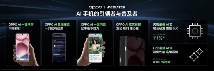 OPPO 作为 AI 手机领域的引领者与普及者,持续深耕系统级 AI 技术,先后推出 AI 一键问屏、AI 意图搜索、AI 一键闪记等功能,这些成果得益于 OPPO 与联发科联合研发的天玑 AI 芯强势驱动。新一代 Find X9 系列所搭载的天玑 9500,以 NPU 处理性能提升 111% 的超强算力,帮助 OPPO 打造行业性能最强 AI 端,并让 OPPO 旗舰成功在端侧AI 性能方面实现 ETHZ AI Benchmark 连续第四代霸榜第 一,结合更流畅更智能的 ColorOS 16 系统,为用户带来新一代最强 AI 终端体验。