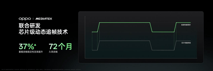针对高温、高亮、高负载等容易产生卡顿而出现不流畅体验的问题,全新一代潮汐引擎首发OPPO 与联发科联合研发的芯片级动态追帧技术。基于 OPPO 对性能供需不平衡这一核心矛盾的深度认知,该技术通过实时追踪系统绘制需求,实现算力的智能动态供给,使重载场景下系统流畅稳定性最高提升 37% ,从底层保障手机即便使用 6 年仍能保持久用流畅。