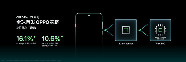以影像领域为例,过去影像创作者高频使用的 4K 60 帧 HDR 视频录制,由于拍摄环境复杂、资源调动多,功耗不亚于最高画质的大型手游。而其中的关键任务如对焦、变焦、画面补偿等,却由制程仅为 22nm 的 Sensor 执行,先进制程的 SoC 参与有限,容易导致发热、卡顿问题。而搭载全新一代 OPPO 潮汐引擎与 OPPO 芯链后,一些原本由 Sensor 承担的高负载任务直接调用 3nm 旗舰芯片算力,这不仅让 4K 60 帧 HDR 视频录制功耗至高降低 16.1% ,更极大地提升影像系统计算效率,让数千万乃至亿级像素数的处理成为可能。